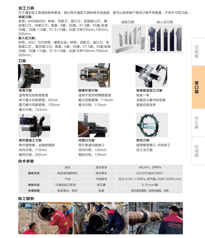 ◎ 可調(diào)節(jié)切割機(jī)構(gòu):自主研發(fā)的可以隨著管道的大小和壁厚不同來(lái)調(diào)節(jié)不同的進(jìn)刀量,已達(dá)到現(xiàn)場(chǎng)切割效果,使得該產(chǎn)品的加工領(lǐng)域更廣泛。