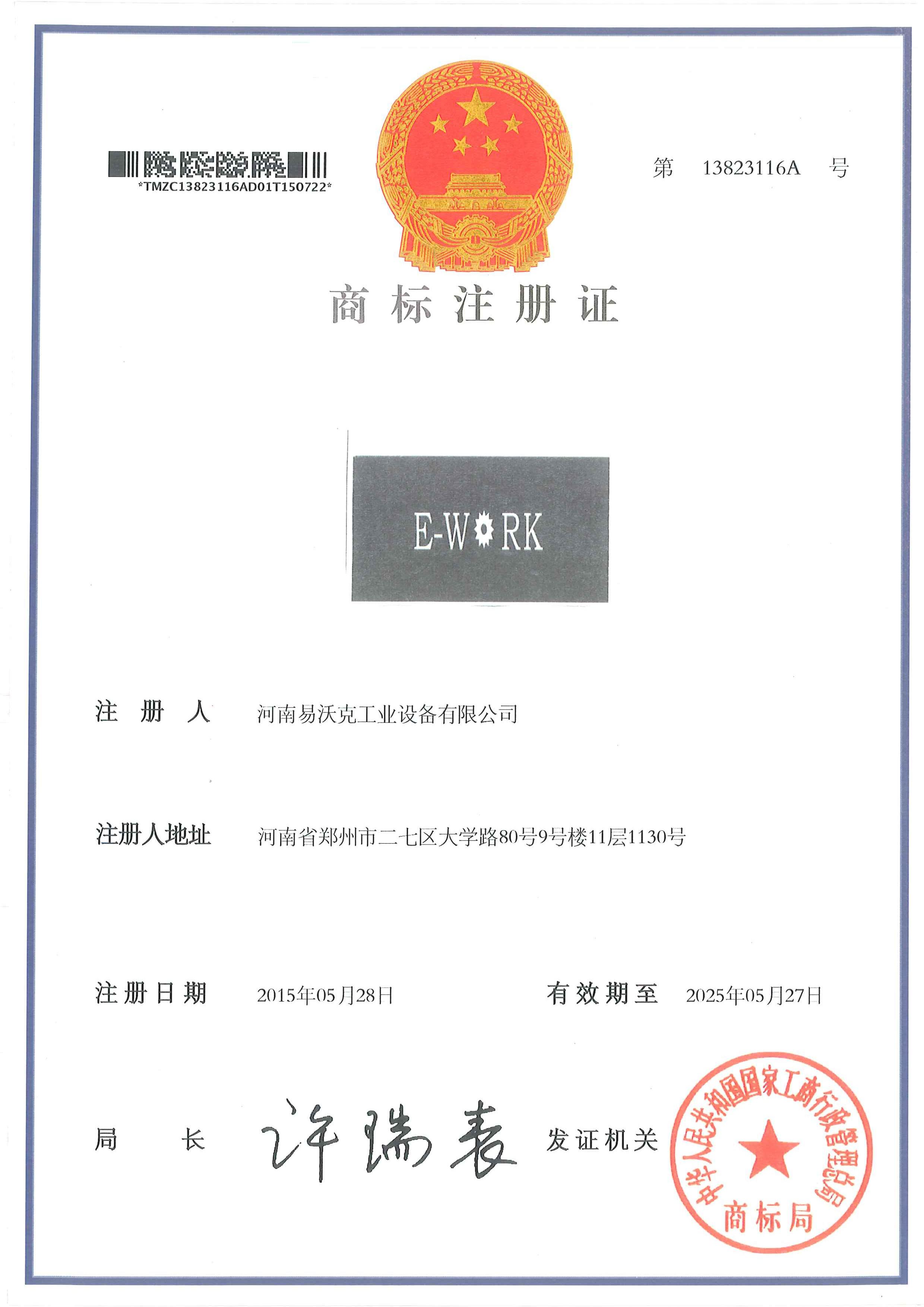 河南易沃克工業(yè)設(shè)備有限公司,公司注冊(cè)商標(biāo)為“E-WORK”,有國(guó)家工商行政管理局商標(biāo)局頒發(fā)的商標(biāo)注冊(cè)證( 13823116A號(hào)),是有效的、是合法的。